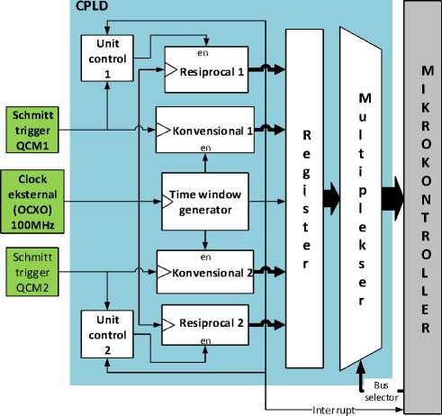 Berdasarkan metode pencacah frekuensi yang ditunjukkan pada Gambar 2 maka dibutuhkan beberapa bagian untuk membangun unit pencacah frekuensi seperti yang ditunjukkan pada Gambar 3. Bagian tersebut diantaranya adalah time window generator untuk membangkitkan sinyal time window satu detik, pencacah digital konvensional untuk mencacah sinyal input sensor QCM, dan pencacah digital reciprocal untuk mencacah clock eksternal. Selain itu, terdapat juga unit control yang digunakan untuk membangkitkan sinyal time counter. Unit control ini dibangun dengan rangkaian sequential D-Flip-flop dengan sumber clock (clk) dari sinyal input sensor QCM dan input data (D) dari sinyal time window. Selain itu, terdapat bagian register yang digunakan sebagai penyimpan data cacahan sementara sebelum dikirimkan ke mikrokontroller melalui fungsi multiplekser. Gambar 3 menunjukkan bahwa bagian-bagian tersebut dibangun di dalam IC CPLD.