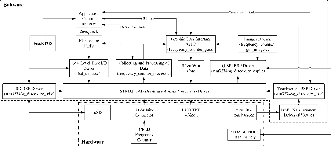 Fitur-fitur pada modul STM32F7 Discovery yang mendukung pengembangan sistem portabel pencacah frekuensi sensor QCM diantaranaya adalah Arduino Shield Connector, Micro SD Card Connector, Quad-SPI Flash Memory, SDRAM, LCD TFT 4.3 inch, capacitive touchscreen, dan ST-LINK/V2-1 yang terhubung dengan mikrokontroller STM32F746NG melalui beberapa peripheral seperti yang ditunjukkan pada Gambar 5. Arduino Shield Connector berfungsi menghubungkan STM32F746NG dengan CPLD XC2C512, micro SD Card Connector berfungsi menghubungkan microSD dengan STM32F746NG agar dapat berfungsi sebagai perangkat penyimpan data hasil pengukuran, Quad-SPI Flash Memory berfungsi menyimpan gambar dan