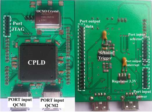 Secara umum pengukuran menggunakan sensor QCM minimal terdiri dari osilator, Pencacah digital, power supply, komputer dan monitor [4]. Pencacah digital dapat dibangun dari rangkaian sequensial, mikrokontroller [5], CPLD [6], [7], ataupun FPGA [8][9]. Penggunaan CPLD sebagai pencacah frekuensi yang dihubungkan ke komputer untuk menampilkan data dan menyimpan data dilakukan menggunakan komunikasi serial UART [9] atau USB HID [6]–[8]. Hasil pengukuran akan ditampilkan baik dalam bentuk tabel maupun grafik di dalam sebuah Graphic User Interface (GUI) yang didesain dengan software seperti matlab [10] ataupun labview [11].