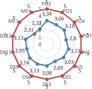 DOI: https://doi.org/10.24843/MITE.2019.v18i01.P0X domain AI yaitu AI3 dan AI5. Enam IT Proses pada domain DS yaitu DS1, DS3, DS6, DS9, DS11 dan DS13. Terdapat dua IT Proses yang dievaluasi pada domain ME yaitu ME1 dan ME4.