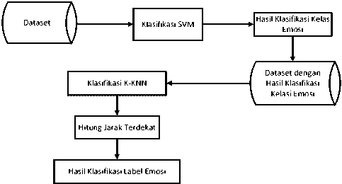 Penelititan ini menggunakan metode gabungan SVM dan KNN pada data twitter. Alur metode usulan yang digunakan terlihat pada Gambar 1. Metode SVM polynomial kernel digunakan untuk melakukan klasifikasi pada ISEAR dataset untuk menentukan kelas emosi. Setelah didapatkan label kelas emosi dilakukan seleksi dataset kembali berdasarkan kelas emosi yang telah ditentukan pada tabel kelas emosi[7]. Metode K-NN akan melakukan klasifikasi kembali berdasarkan dataset yang sudah ditentukan kelas emosinya dari metode SVM. K-NN bekerja dengan melakukan perhitungan euclidean distance untuk menentukan label emosi yang memiliki jarak terdekat dengan data uji.