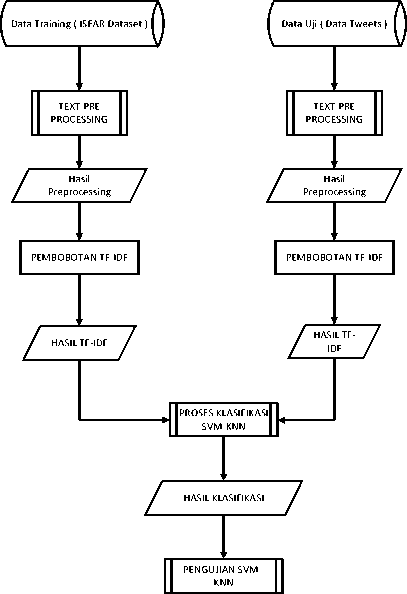 Selanjutnya Sistem akan melakukan Analisis dan Pembobotan menggunakan Metode TF IDF. Pada Proses Metode TF IDF ini dilakukan penentuan bobot data berdasarkan kemunculan term (istilah). Semakin sering sebuah istilah muncul, semakin tinggi bobot data untuk istilah tersebut, dan sebaliknya. Untuk Sub Proses Klasifikasi SVM –KNN ditunjuk pada Gambar 4.