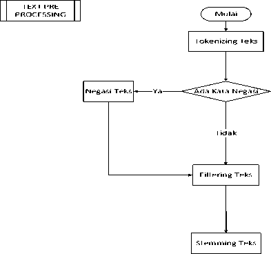 Untuk subproses Text preprocessing ditunjuk pada Gambar 3. pada proses ini Data tweet tersebut akan dilakukan tokenizing dengan cara dilakukan pemisahan – pemisahan tiap kata pada setiap data tweet. Proses selanjutnya dilakukan filtering. Pada proses filtering ini dilakukan proses seleksi terhadap kata-kata yang dihasilkan dari proses tokenizing, selanjutnya Algoritma stop list akan membuang kata-kata yang tidak penting seperti kata ganti, kata keterangan, kata sambung, kata depan dan kata sandang. dan algoritma word list akan menyimpan katakata yang penting. Selanjutnya Sistem melakukan proses stemming, Proses Stemming dilakukan untuk mencari kata dasar dari setiap kata yang telah lolos proses filtering.