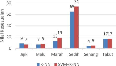 Positif maka Klasifikasi selanjutnya hanya menggunakan kategori emosi yang memiliki kelas positif Demikian juga sebaliknya. Dari hal tersebut juga mempengaruhi Klasifikasi K-NN pada nilai K. Selain itu hasil pengujian tersebut juga menunjukkan perbendaan nilai kesesuaian dalam Klasifikasi Emosi pada Gambar 8. Berikut hasil Evaluasi Kesesuaian Klasifikasi Selurh Emosi.