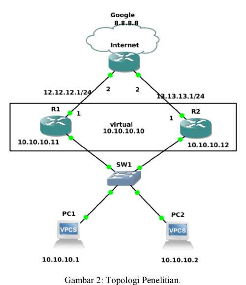 Tools GNS3 dipilih karena mendekati kondisi real di lapangan. Pada Gambar 2: client/host dalam hal ini PC1 dan PC2, akan mengakses ke server. Secara fisik R1 dan R2 bertindak sebagai gateway. R1 bertindak sebagai main router sedangkan R2 sebagai backup.