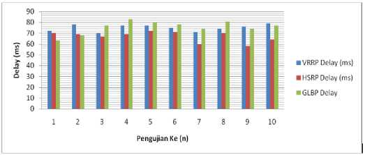 B. Perbandingan Hasil Pengujian Delay pada Metode VRRP, HSRP, dan GLBP.