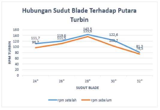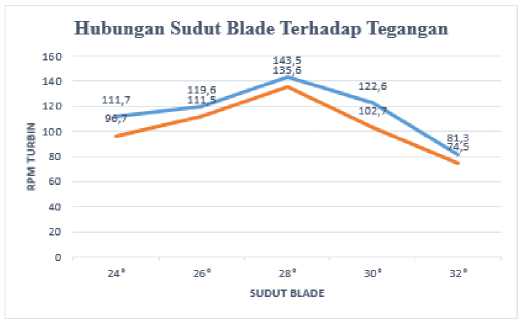 Gambar 6 merupakan hasil pengukuran tegangan ini dilakukan setelah generator dibebani dengan beban sebesar 25 watt. Hasil pengukuran tertinggi didapatkan pada sudut kemiringan blade 280 dengan menghasilkan tegangan sebesar 143,5 watt pada saat sebelum dibebani dan menghasilkan tegangan sebesar 135,6 watt setelah diberi beban sebesar 25 watt. Hal ini disebabkan karena putaran turbin pada sudut 280 merupakan putaran turbin terbesar sehingga putaran generator