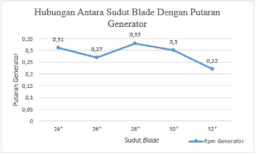 Garfik 5 merupakan hasil pengukuran putaran generator ini dilakukan setelah generator dikopel dengan turbin menggunakan gear dengan ratio 1:12 sehingga generator dapat berputar. Hasil pengukuran tertinggi didapatkan pada sudut kemiringan blade 280 dengan menghasilkan putaran generator sebesar 6972 rpm. Hal ini disebabkan karena putaran turbin pada sudut 280 merupakan putaran turbin terbesar sehingga putaran generator yang dihasilkan juga besar. Tekanan air yang mengalir memasuki turbin mengenai sisi aktif blade sehingga dapat memutar turbin dan menghasilkan putaran generator yang maksimal. Pada sudut 240, 260, 300 dan 320 aliran air yang memasuki turbin tidak mengenai sisi aktif turbin sehingga membuat putaran turbin tidak terlalu tinggi sehingga membuat putaran generator tidak maksimal.