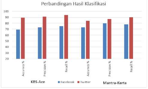 Dari Gambar 2 dapat dilihat bahwa nilai akurasi, presisi dan recall pada dua media sosial yaitu Facebook dan Twitter menghasilkan nilai yang berbeda dengan metode klasifikasi yang sama yaitu Naïve Bayes Classifier. Nilai akurasi tertinngi terdapat pada media sosial Twitter untuk klasifikasi data KBS-Ace, dengan nilai akurasi mencapai 89%, nilai presisi 91% dan recall 94%. Sedangkan akurasi terendah metode Naïve Bayes Classifier digunakan pada kasifikasi data