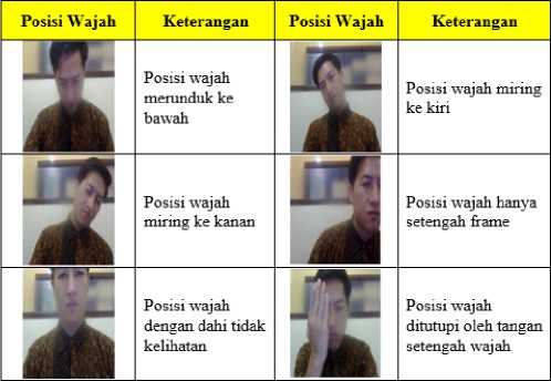 Pada penelitian ini wajah akan dideteksi secara sempurna apabila wajah dihadapkan secara tegak lurus menghadap ke kamera. Selain itu, terdapat beberapa posisi wajah yang dapat dideteksi oleh sistem monitoring kehadiran perkuliahan ini. Posisi wajah yang dapat dideteksi oleh sistem dapat disajikan pada Tabel I.