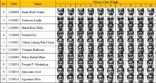 Pada Penelitian ini terdapat 10 jumlah mahasiswa yang digunakan sebagai objek penelitian. Dari masing-masing data tersebut akan diambil citra wajah yang digunakan sebagai data latih citra, dimana data latih citra yang diambil sebanyak 10 data latih citra. Untuk rincian data latih citra dapat dilihat pada Tabel III.