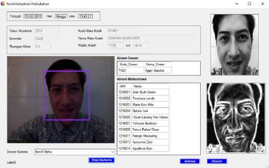 Intisari— Daftar kehadiran perkuliahan adalah salah satu faktor penting pada aktivitas perkuliahan karena merupakan salah satu syarat untuk mengikuti ujian akhir semester. Mengingat pentingnya kehadiran perkuliahan maka diperlukan sistem kehadiran dengan teknologi komputer vision yang diharapkan mampu mengatasi permasalahan pada presensi secara manual. Permasalahan-permasalahan umum yang terjadi pada presensi secara manual yaitu duplikasi tanda tangan, salah mengikuti jadwal kuliah, dan pembuatan laporan perkuliahan. Pada penelitian ini teknologi komputer vision yang digunakan ialah pengenalan wajah. Adapun tahap-tahap pengenalan wajah pada penelitian ini yaitu pendeteksian, ekstraksi ciri dan pengenalan. Metode-metode yang mendukung proses pengenalan wajah yaitu metode Viola-Jones, Sobel, dan KNN. Metode Viola-Jones pada penelitian ini diterapkan pada proses pendeteksian wajah, dimana tingkat akurasi dari metode Viola-Jones lebih dari 90%. Sedangkan proses ekstraksi ciri menggunakan metode sobel. Dan proses pengenalan wajah menggunakan metode KNN, dimana metode KNN memiliki tingkat akurasi yang tinggi. Selain itu pada penelitian ini menggunakan penentuan jarak pengambilan citra wajah dan posisi wajah. Tingkat keakurasian dari penelitian ini adalah sebesar 94.79%.
