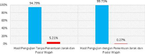 Berdasarkan Gambar 9 terdapat perbandingan hasil pengujian pengenalan wajah dimana hasil pengujian pengenalan wajah tanpa penentuan jarak dan posisi wajah menghasilkan tingkat akurasi sebesar 94.79%. Sedangkan hasil pengujian pengenalan wajah dengan menggunakan penentuan jarak wajah dari kamera dan posisi wajah terjadi peningkatan tingkat akurasi menjadi 99.73%.