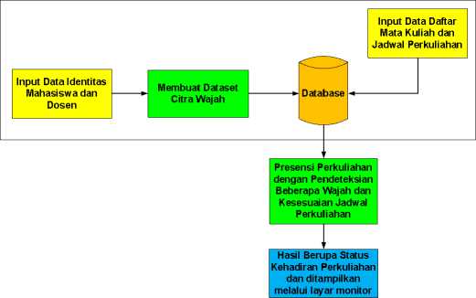 Dapat dilihat pada Gambar 2 proses pertama yang dilakukan pada penelitian ini adalah menginput data identitas mahasiswa, membuat dataset citra wajah, menginput data jadwal perkuliahan dan jadwal perkuliahan ke sistem. Setelah proses tahapan pendeteksian wajah, tahap selanjutnya adalah proses pengenalan wajah ketika melakukan presensi perkuliahan yang sudah disinkronisasi oleh jadwal perkuliahan.