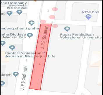 Proses penandaan area larangan parkir pada Google Maps dengan menentukan titik latitude dan longitude berikut -8.672188, 115.218086, -8.672190, 115.218186, -8.673030, 115.218090, -8.673010, 115.217993. Untuk mempermudah saat validasi area larangan parkir, maka ditentukan titik tengah koordinat suatu area larangan parkir. Dari gambar 2 yang menampilkan area larangan parkir, selanjutnya ditentukan titik tengah koordinat area larangan parkir dengan nilai berikut -8.672551, 115.218090.