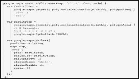 Fungsi memberikan nilai benar jika titik berada di dalam area polygon melalui perintah google.maps.geometry.poly.containsLocation(). Untuk menentukan apakah suatu titik jatuh, berada, maupun melewati polyline dan polygon, maka digunakan perintah google.maps.geometry.poly.isLocationOnEdge(). Fungsi mengembalikan nilai true jika jarak antara titik dan titik terdekat pada garis atau tepi jatuh dalam toleransi yang ditentukan. Nilai toleransi standar adalah 10-9 derajat.