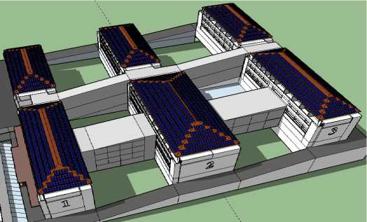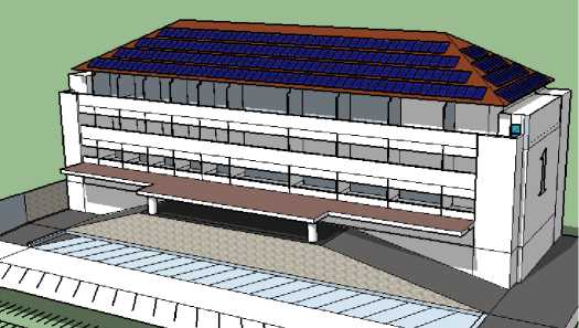 Berdasarkan buku MEP tahun 2010, luas atap seluruh Gedung RSPTN Universitas Udayana adalah 7,044 m2. Sementara, luas satu modul surya yang dipilih berdasarkan datasheet adalah 2.19 m2. Jumlah modul surya yang dapat dipasang pada atap dihitung dengan cara membagi luas atap dengan luas modul surya, sehingga didapatkan hasil 2,532. Gambar 8 merupakan gedung RSPTN Universitas Udayana beserta modul surya yang bisa dipasang pada atap.
