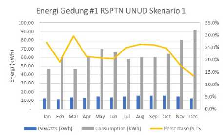 Daya listrik maksimum yang digunakan Gedung #1 RSPTN Universitas Udayana berdasarkan data AMR tahun 2015 adalah 183,680 Watt. Jika dibandingkan dengan daya yang dihasilkan PLTS pada skenario 1, maka PLTS mampu mensuplai 76.77 % dari konsumsi daya listrik tertinggi. Berdasarkan data pada buku MEP RSPTN Universitas Udayana Gedung #1, total daya yang dibutuhkan jika Gedung #1 sudah beroperasi penuh adalah 455,151 Watt. Sehingga, daya listrik PLTS yang sebesar 142,560 Watt bisa mensuplai 31.32 % dari total daya jika Gedung #1 sudah beroperasi penuh.