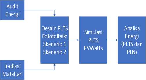 Penelitian tentang perancangan PLTS ini dilakukan di komplek gedung rumah sakit milik Universitas Udayana yang disebut Rumah Sakit Perguruan Tinggi Negeri (RSPTN) Universitas Udayana yang berada di Bukit Jimbaran. Data yang digunakan bersumber dari datasheet komponen PLTS yang akan digunakan, data instalasi Mechanical Electrical Plumbing (MEP) RSPTN Universitas Udayana, data profil beban Automatic Meter Reading (AMR) yang didapat dari PLN, data pengukuran intensitas matahari. Untuk memperkirakan energi yang dihasilkan PLTS, digunakan simulator PVWatts. Hasil PVWatts kemudian dibandingkan dengan kondisi pembebanan gedung RSPTN. Gambar 1 memperlihatkan skematik metodologi penelitian. Audit energi dilaksanakan untuk mengetahui bagaimana kondisi sistem kelistrikan, peralatan, dan pola konsumsi energi di RSPTN. Pengukuran iradiasi dilakukan untuk mengetahui potensi energi matahari di lokasi RSPTN.