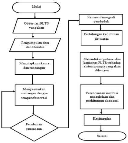 Langkah pertama adalah melakukan observasi terhadap PLTS Datah. Setelah itu melakukan studi literatur terkait sistem pompa bertenag amatahari. Menmbuat skema dan rancangan sistem pemompaan air. Menghitung demografi penduduk Dusun Asah Teben. Menghitung perkiraan kebutuhan air bersih masyarakat berdasarkan proyeksi dari jumlah penduduk dan fasilitas-fasilitas di Dusun Asah Teben. Penentuan tipe pompa yang akan digunakan untuk penyediaan air bersih. Analisis sistem pompa air yang telah ditentukan berdasarkan tipe pompa guna untuk pemenuhan kebutuhan air bersih dan perhitungan kapasitas yang sesuai dengan kapasitas PLTS Datah. Perancangan pengelolaan dan perawatan sistem distribusi air bersih kedepannya.