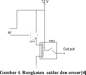 Sensor pendeteksi air ini berfungsi sama seperti saklar. Dalam sensor ini digunakan transistor sebagai penghubung ke relay, seperti yang ditunjukkan pada gambar 4. Relay hanya menghubungkan catu daya dengan pin VCC mikrokontroler saat pasokan air terputus. Saat pasokan air masuk mikrokontroler dalam keadaan tanpa catu daya(power off) sehingga bisa menghemat pemakaian energi dari batere.