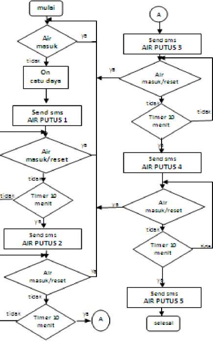 8. Jika sebelum mengirim SMS AIR PUTUS 5 pasokan air sudah masuk kembali ke dalam kolam catu daya akan terputus kembali dari mikrokontroler sehingga system kembali pada keadaan awal