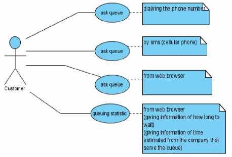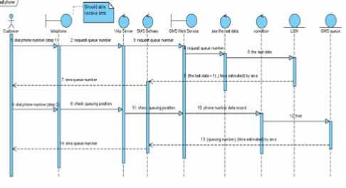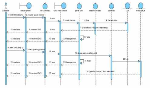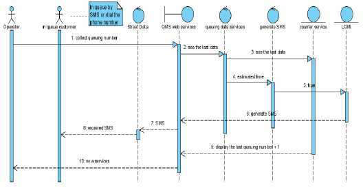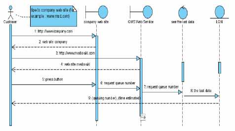 Pada disain ini, Customer akan mempunyai dua metode untuk meminta nomer antrian, metode pertama dengan menggunakan ponsel. Customer dapat meminta nomer antrian dengan menekan nomer telepon tertentu (nomer yang terhubung ke web service). Selain itu, Customer dapat juga mengirimkan pesan sms ke web service untuk meminta nomer antrian dan waktu pelayanan. Selanjutnya, web service membangkitkan nomer antrian dan waktu pelayanan, kemudian mengirimkannya ke ponsel Customer melalui pesan sms. Metode kedua dengan menggunakan web browser. Customer meminta nomer antrian dan waktu perolehan pelayan melalui website penyelenggara jasa layanan umum.