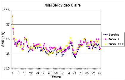 Tabel 1, menunjukan perbandingan laju bit untuk setiap deret video menggunakan 3 mode pengkodean, dimana peningkatan nilai SNR menghasilkan efisiensi pada penurunan laju bit yang signifikan. Penambahan kompleksitas encoder akibat mekanisme perluasan area pencarian pada optimalisasi teknik estimasi dan kompensasi gerak dapat meningkatkan rasio kompresi pada deret video dibandingkan dengan mode baseline. Efisiensi terbesar diperoleh pada deret video Foreman yang mengindikasikan implementasi mode optional Annex D dan F dapat mengkompensasi karakteristik deret video dengan korelasi antar frame yang besar.