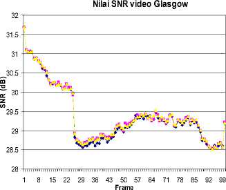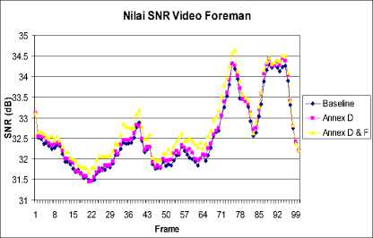 Kombinasi mode UMV dan Advance Prediction juga memberikan kontribusi pada peningkatan nilai SNR yaitu 0.0606 dB pada deret video Claire, 0.2674 dB untuk deret video Foreman, dan 0.0401 dB. Hasil ini juga menunjukan bahwa mode optional UMV dan Advance Prediction mampu meningkatkan kinerja enkoder video H.263 untuk karakteristik deret video masukan dengan korelasi antar frame cukup besar, seperti ditunjukan oleh deret video Foreman.