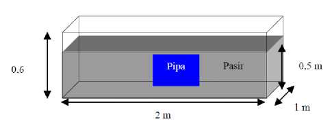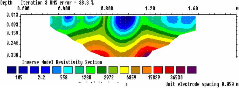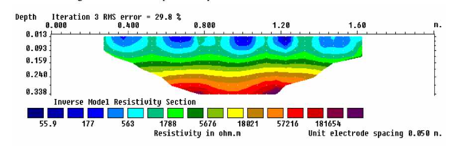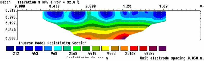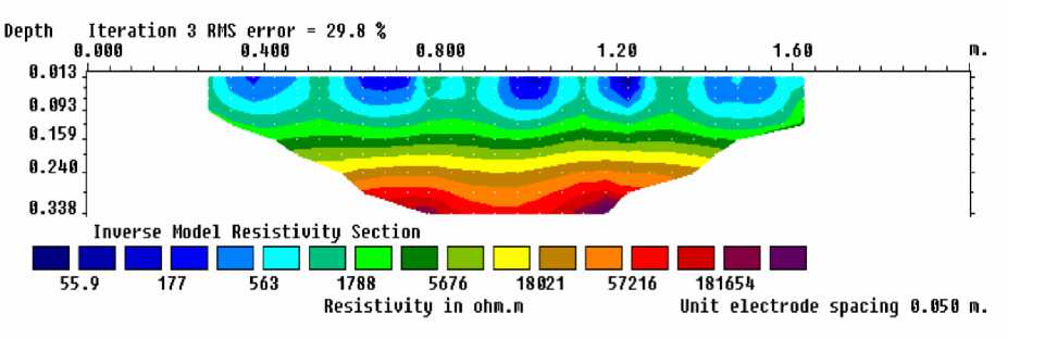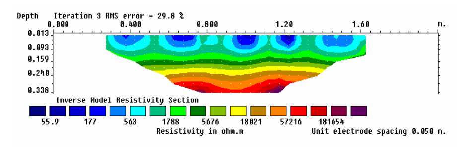 Pada posisi ini 3 (tiga) buah pipa diletakkan di bawah permukaan pasir secara mendatar pada kedalaman ± 30 cm dari permukaan pasir. Salah satu pipa diletakkan dengan jarak dari tepi kanan kaca sekitar 55 cm dan jarak dari tepi kiri sekitar 105 cm, sedangkan 2 buah pipa lainnya diluar lintasan pengukuran (Gambar 6). Hasil inversi dapat dilihat pada Gambar 7 dengan nilai resistivitas yang terukur berkisar 181.654 Qm dengan kedalaman ±30 cm di bawah permukaan pasir.