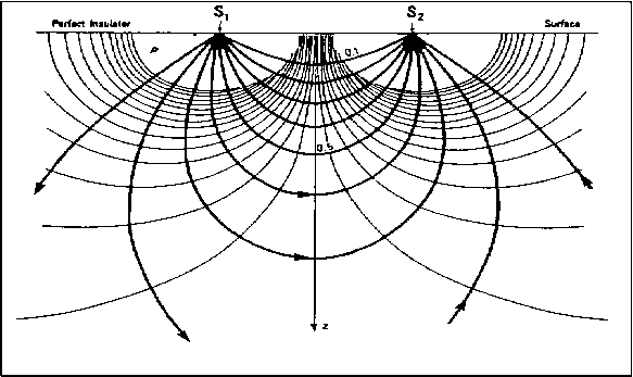 Ilustrasi garis ekuipotensial yang terjadi akibat injeksi arus ditunjukkan pada dua titik arus yang berlawanan di permukaan bumi.