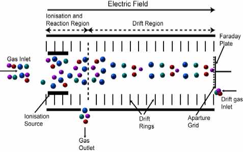 Principle IMS: Basic used in this technology is measurement of gas ion mobility in an electric field. Mobility of ions is determined by ion velocity, which is measured in a drift cell under effect of electric field. The most important part of IMS method is its IMS-Cell. Process in IMS-Cell is simply depicted in Figure 1.