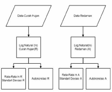 Hujan adalah suatu proses random, dari hasil pengukuran curah hujan menunjukkan bahwa hujan diasumsikan sesuai dengan proses random, hal ini menyebabkan peneliti memilih pendekatan untuk senantiasa mengestimasi curah hujan menggunakan parameter. Data diolah untuk dengan parameter : mean (rata-rata), standart deviasi, variance (standar deviasi kwadrat), autokorelasi dan autokovariance dilakukan pengolahan data menggunakan software Matlab.