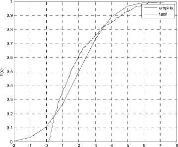 pengukuran curah hujan, atau berarti lognormal untuk data pengukuran curah hujan. Hasil KS tes untuk lognatural curah hujan mempunyai nilai : untuk D = 0.15 adalah 0.7537, untuk D=0.10 adalah 0.7961, untuk D=0.05 adalah 0.8696, untuk D = 0.025 adalah 0.9272, sedangkan untuk D = 0.01 adalah 1.0045. Dari hasil KS tes ini menunjukkan bahwa outage 0.01 ada satu data yang ditolak.