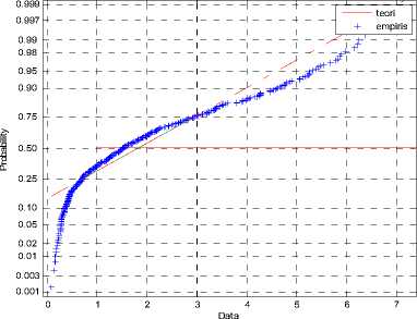 Untuk pengecekan data kenormal data menghasilkan nilai bahwa data tersebut adalah normal. Uji kenormalan data mengunakan metode Kosmogorov-Smirnov dihasilkan data yang normal hasilnya sesuai Gambar 6. Dalam pengujiannya dilakukan probabilitas kenormalan dari data diperoleh bahwa data tersebut adalah normal hasilnya sesuai Gambar 7.