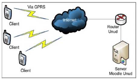 Three mobile phones run on GPRS of the same operator. They access the e-learning server from three different locations as mentioned above. The network model is shown in Figure 1.