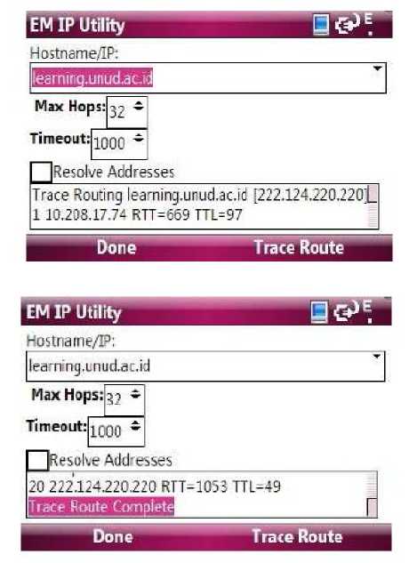 The experiments have been done in two campuses of Udayana University and in Tabanan Area (off campus). The distance between three locations is around 35 km. According to Google Earth that air distance between Sudirman campus and Jimbaran campus is around 14.42 km, and 16.07 km of distance between Sudirman and Tabanan. The university e-learning which is located in http://elearning.unud.ac.id was accessed using FTP, in WinSCP installed in laptop as a client , and MLE Moodle plug-ins. Course contents in the server such as slides, articles, and quizzes were browsed and downloaded. Browsing and downloading process were part of the experiments. The contents are in pdf, ppt, and mpeg format. Each content has maximum size of 2 MB.