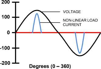 Beban yang komponen arusnya tidak proporsional terhadap komponen tegangannya, sehingga bentuk gelombang arusnya tidak sama dengan bentuk gelombang tegangannya. Tidak terdapat hubungan yang linier antara arus dan tegangan. Beban non-linier menyerap arus non sinusoidal demikian juga arus harmonik, walaupun disuplai oleh tegangan sinusoidal. Seperti Gambar 2 di bawah ini. Contoh beban non-linier antara lain penyearah, UPS, komputer, pengaturan kecepatan motor, lampu-lampu pelepasan, alat-alat ferromagnetik, motor DC, dan tungku busur api, dan lain-lainnya.