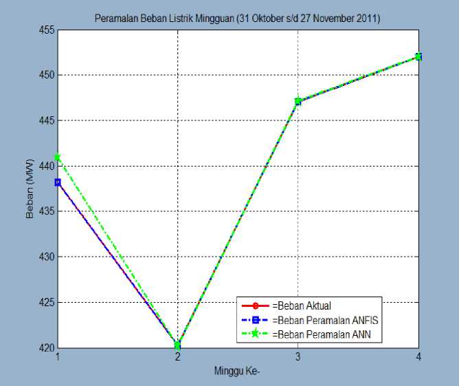 Gambar 3. Perbandingan Beban Listrik Aktual Mingguan Dengan Beban Hasil Peramalan Menggunakan Metode ANFIS dan ANN