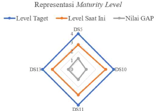 Berdasarkan Tabel 3 menunjukan rata-rata dari pengukuran maturity level sistem SIKEKAL yang berada pada level 2 (Repeatable but Intuitive) pada domain DS5, DS11 dan DS13, hal ini menunjukan bahwa sistem SIKEKAL telah menerapkan prosedur yang berlaku dalam melakukan manajemen keamanan sistem, manajemen data serta manajemen operasi sistem yang digunakan namun masih terdapat beberapa kesalahan yang memungkinkan untuk terjadi pada proses tersebut. Sedangkan pada domain DS10 berada pada level 3 (Defined Process), dengan ini sistem SIKEKAL dalam proses manajemen permasalahan yang terjadi telah dilakukan berdasarkan proses standarisasi dan didokumentasikan sesuai dengan prosedur.