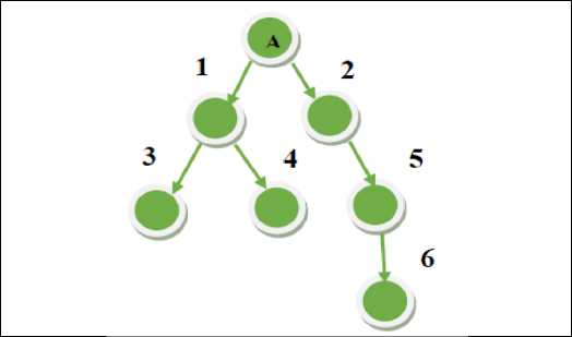 Gambar 1 menunjukkan bagaimana menemukan tujuan dengan menggunakan algoritma DFS. Pencarian dimulai dari simpul awal “A” dan kemudian bergerak ke node 1 (paling kiri), kemudian menelusuri cabang yang ada dibawahnya yaitu Node 2. Jika tujuannya belum ditemukan pada Node 2, maka pencarian akan berpindah ke node sebelelah kanan yaitu Node 3, dan pencarian akan naik ke atas ke cabang yang ada disebelah kanan yaitu Node 4 dan begitu seterusnya.