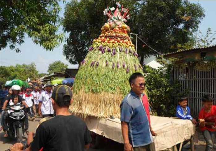 “… Masyarakat mengirim hasil buminya kepada kepala desa atau kepada keraton (semua hasil kebun yang terpendam seperti, ubi talas, kembili dan kentang) dan sura gumantang (buah-buahan dan sayur-sayuran). Selain itu, ada juga hasil ternak seperti ayam, bebek, kambing, kerbau dan sapi …” (Wawancara, 26 Mei 2015)