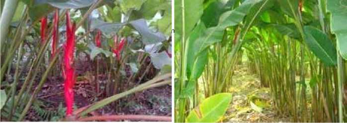agrowisata adalah bunga potong tropika. Bunga potong yang pertama kali dikembangkan di Desa Kerta adalah bunga potong tropika jenis Heliconia (pisang-pisangan). Pengembangan bunga potong jenis ini, dimulai sejak tahun 2003 oleh kelompok tani Sekar Bumi dan mengalami perkembangan luas areal penanaman, jumlah populasi dan varietas. Bunga potong tropika (pisang hias) menjadi salah satu komoditi unggulan di tempat ini, karena memiliki beberapa kelebihan, diantaranya mudah dibudidayakan/ dikembangkan, pertumbuhan yang relatif cepat, memiliki jumlah anakan yang cukup banyak, memiliki nilai ekonomi yang cukup tinggi, dapat dimanfaatkan sebagai pakan ternak dan tanaman konservasi. Tanaman bunga potong tropika dapat dilihat pada Foto 2.