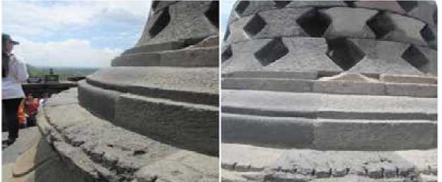 Keausan pada Relief Dekoratis Stupa Teras yang Berisikan Arca Kunto Bimo Sumber : Dok. Pribadi 2016