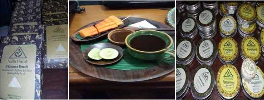 Foto 2. Dari kiri ke kanan: Ginger Tea dan Rujak, Bentuk Kemasan Boreh Bali Sumber: Dokumentasi Pribadi