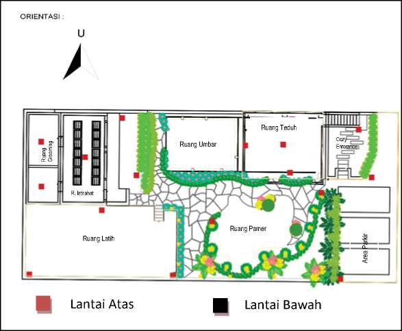 Model taman ini terdiri dari ruang-ruang khusus yang setiap ruang memiliki fungsi dan manfaatnya masing-masing. Kapasitas ruang parkir menyediakan luas yang cukup untuk 3 mobil dan 5 sepeda motor. Desain ruang parkir didasari ketentuan dimensi ukuran untuk jenis mobil mini bus, sedan dan jeep. Pengaplikasian jalan setapak memakai material batu andesit untuk tujuan manfaat keamanan dan estetika
