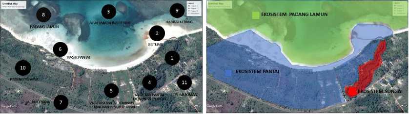 Pantai Teloek Dalam memiliki sebelas tautan lingkungan yang kemudian dianalisis untuk diperoleh informasi mengenai potensi dan permasalahannya sebagai dasar perencanaan (Gambar 2a). Tautan lingkungan dibutuhkan untuk melihat pengaruh tapak terhadap lingkungan sekitar maupun sebaliknya. Setelah identifikasi tautan lingkungan, maka dilakukan analisis ekosistem. Analisis ekosistem perlu dilakukan karena pesisir pantai merupakan ekosistem kompleks yang menghubungkan dua atau lebih ekosistem dalam hal ini akuatik dan terestrial. Fitriana et al. (2018) menyatakan bahwa tidak seluruh area pesisir pantai dapat dimanfaatkan secara langsung karena terdapat area-area sensitif yang apabila dimanfaatkan langsung dapat membahayakan pengguna atau lingkungan itu sendiri. Berdasarkan hasil analisis struktur lanskap patch dan
