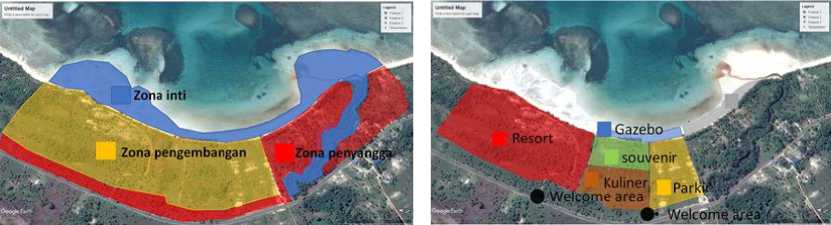 Berdasarkan hasil keseluruhan analisis yang diacu pada Tabel 5, 6, dan 7, maka konsep ruang dibagi menjadi tiga yaitu zona inti, zona penyangga, dan zona pengembangan (Gambar 3a). Zona inti merupakan area pasir putih yang menjadi daya tarik utama pantai dan juga sungai yang berada di sisi selatan pantai. Zona penyangga berada di selatan pantai yang dibelah oleh sungai. Area ini perlu diproteksi karena pertama, didominansi oleh vegetasi pohon yang memiliki nilai penting (Nurisyah, 2015). Kedua, untuk menjaga area estuari, ruang hijau di sempadan sungai perlu dipertahankan (Maryono, 2016). Area penyangga juga ditempatkan di sepanjang jalan dengan alasan diproyeksikan suatu saat kawasan ini akan ramai dan menimbulkan bising kendaraan sehingga perlu adanya vegetasi penyangga untuk mereduksi bising. Selain itu, vegetasi juga dapat menjadi filter pandangan untuk menjaga privasi pengguna tapak. Pada perencanaan ini direncanakan adanya pembagian enam ruang mikro yang dibagi berdasarkan aktivitas yaitu resort, gazebo