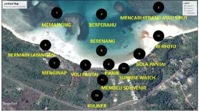 Kawasan wisata di Pantai Teloek Dalam masih dibutuhkan banyak atraksi wisata untuk meningkatkan daya tarik wisatawan. Berdasarkan hasil wawancara, pilihan wisata di sekitar masih sedikit dan atraksi yang ditawarkan cenderung monoton. Pada konsep perencanaan kawasan wisata ini terdapat 13 aktivitas yang dapat dilakukan oleh wisatawan antara lain memancing, berperahu, mencari kerang, berenang, berfoto, piknik, dan bola pantai. Selanjutnya pengunjung juga dapat melakukan aktivitas voli pantai, bermain layangan, menginap, memandangi sunrise, membeli cendera mata, dan kuliner (Gambar 4). Aktivitas tersebut dapat dilakukan di dua dari tiga ekosistem yang ada pada tapak, yaitu ekosistem pantai dan padang lamun. Sensitivitas estuari sangat rentan sehingga area ekosistem sekitar sungai tidak dibuka untuk menjaga keberlanjutannya. Area terestrial di ekosistem pantai memiliki luas daratan yang cukup dan memungkinkan untuk dikembangkan. Selanjutnya, area akuatik menyimpan manfaat lebih dari sekedar kegiatan rekreasi. Alasannya adalah karena ekosistem lamun memiliki nilai penting yang menjadikan kawasan ini kaya akan keanekaragaman fauna air seperti gonggong yang merupakan satwa khas pantai ini. Terlebih pengembangan wisata berbasis ekosistem lamun masih jarang dilakukan dikembangkan di Indonesia (Kordi, 2011).