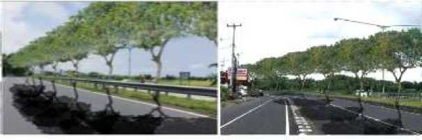 Menurut Nurisyah dan Adriani (2015), jalan yang cukup lebar sebaiknya memilih jenis tanaman yang mengikuti karakter jalan yaitu pohon-pohon yang ukurannya besar. Pohon yang mendekati persyaratan-persyaratan yang telah ditentukan digunakan untuk pembuatan simulasi. Pemilihan pohon jenis pohon menghasilkan beberapa jenis pohon yaitu Populus nigra (Poplas hitam), Samanea saman (Ki hujan), Pterocarps indicusn (Angsana), Salix babylonica (Dedalu), Araucaria heterophylla (Cemara Norfolk), Polyalthia longifolia (Glodogan tiang) dan Filicium decipiens (Kirai payung). Selanjutnya foto lokasi dan bentuk tajuk pohon yang memenuhi kriteria pohon tepi jalan diedit menggunakan software Adobe Photoshop CS3. Manipulasi foto ini mampu mengkomunikasikan hubungan dan bentuk visual karena foto merupakan representasi kenyataan yang paling mendekati (Laurie, 1990). Aplikasi Adobe Photoshop CS3 membantu untuk pembuatan, penyuntingan dan manipulasi tampilan termasuk koreksi warna, pemberian efek tampilan pada foto simulasi.